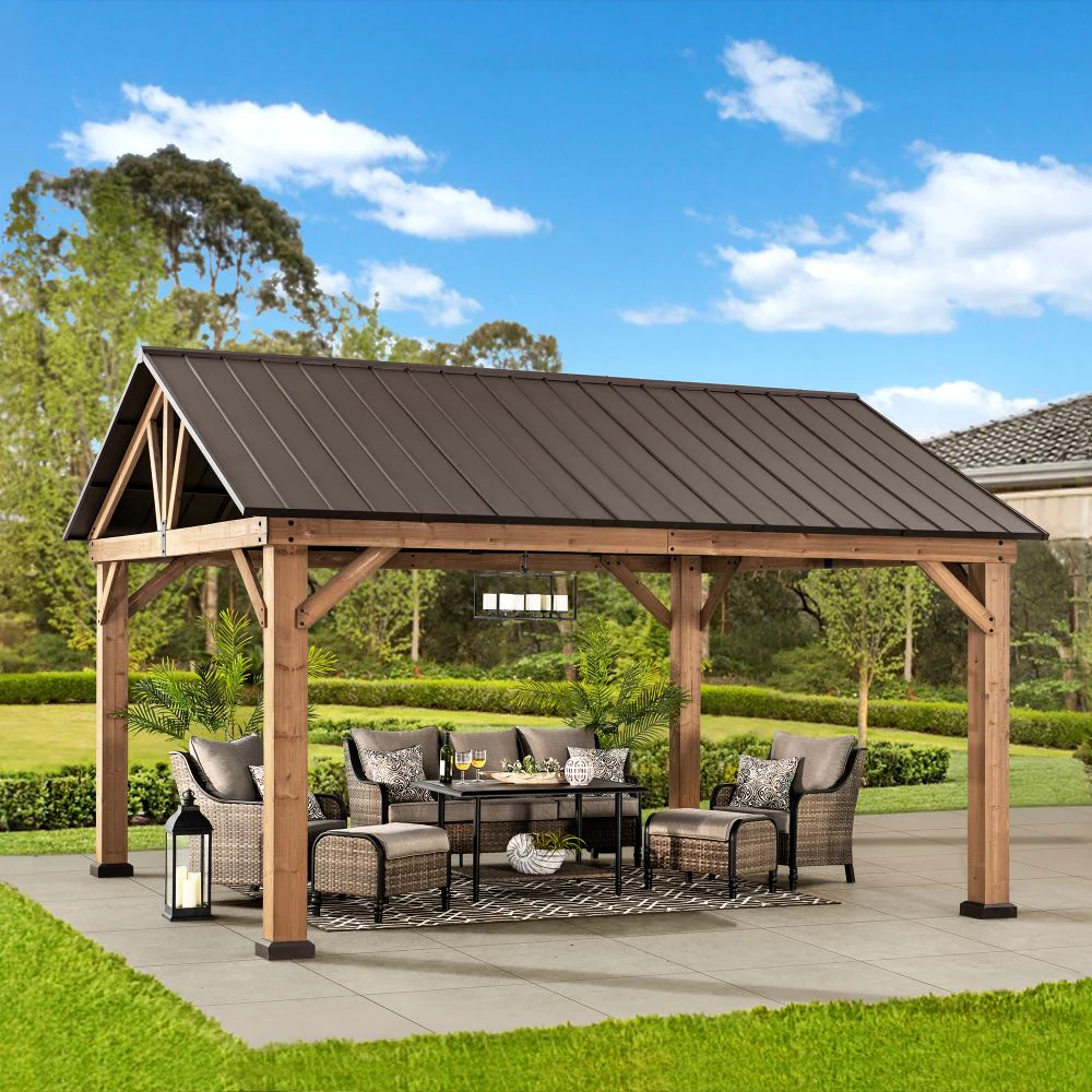 One of the biggest differences between low-cost and well-designed outdoor gazebo options lies in the materials used. Budget gazebos often rely on lightweight metals or thin fabric canopies that may struggle against wind, rain, and prolonged sun exposure. In contrast, models like the SUNJOY 13×15 Gable Roof Gazebo feature a cedar wood frame combined with a powder-coated steel roof, offering a more stable and weather-resistant structure. Buyers browsing gazebos for sale should carefully evaluate frame strength and roof construction, as these factors directly impact longevity.