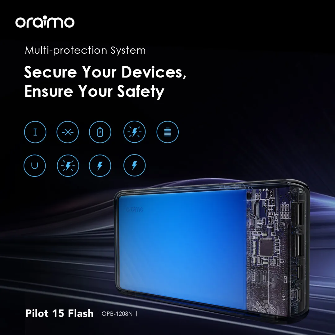Safety is a top priority with the oraimo Pilot 15 Flash. This oraimo power bank is equipped with a multi-protection system that safeguards your devices against overcharging, overheating, short circuits, and more. No matter what you’re charging, oraimo ensures a secure and efficient charging process, so you can power your devices with confidence every time.