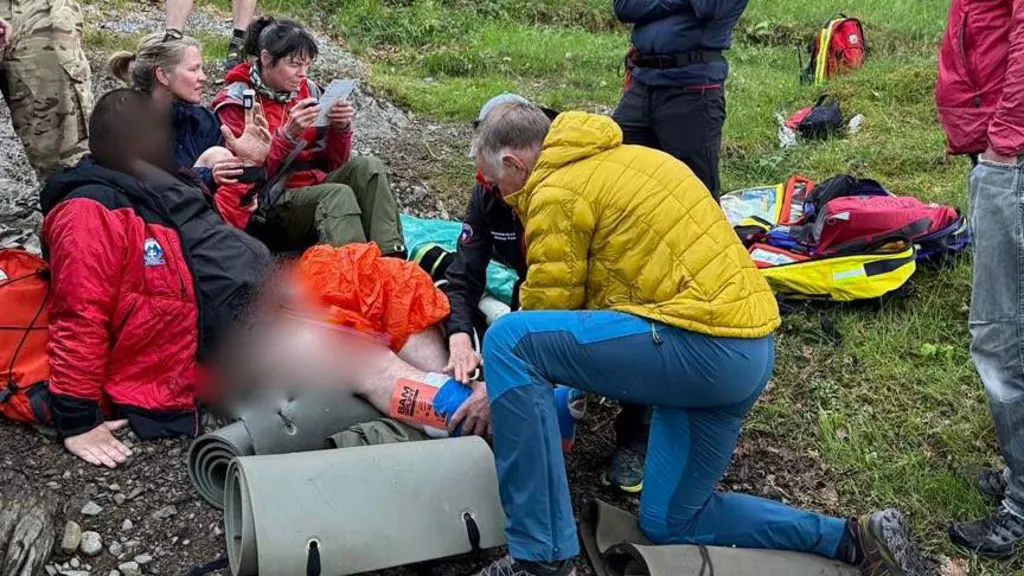 Fellow colleagues came to the aid of a mountain rescue volunteer after he fell and suffered a significant lower-leg injury while out training search dogs.